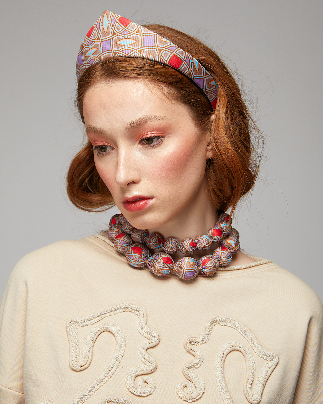 Колье шелковое с лентами. Внутри — легкие деревянные шарики (липа).