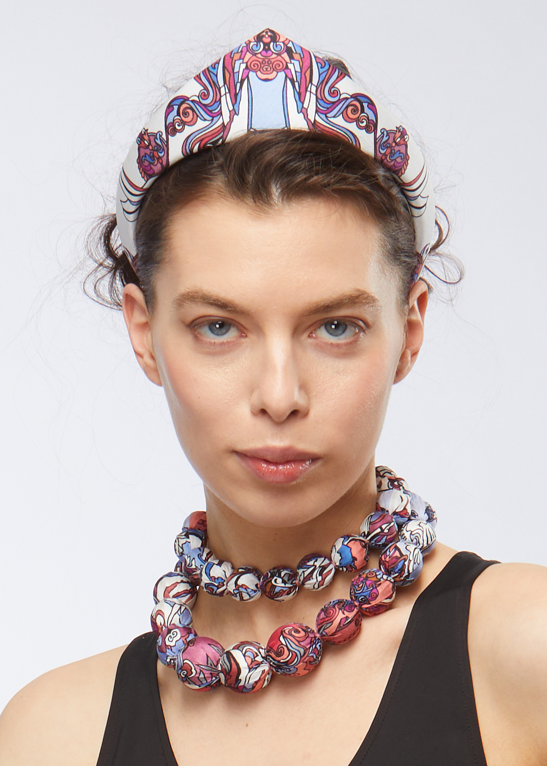 Комплект из двух колье с шелковыми лентами. Внутри — легкие деревянные шарики (липа). Можно носить по отдельности.